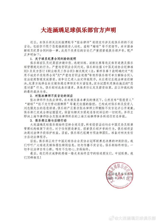 北京时间10月17日,中冠联赛大连汉宇俱乐部发布声明称,张兵律师有关俱乐部“假投资者”、“赌博”、“拒付劳务费”等情况的陈述不实。大连汉宇足球俱乐部官方声明:近日,俱乐部注意到微博账号“张兵律师”持续发布涉及我俱乐部的虚假言论,包括但不限于恶意揣测投资者动机、做出“对赌”等虚假情节,以及对球员吉勇宫缩的片面误解等。这种不可靠的言论严重损害了我们俱乐部的声誉。现公告如下: 1、球员吉勇合同纠纷的说明。前俱乐部球员吉勇涉嫌骗取赔偿、逃避训练、消极比赛等违反俱乐部道德和管理规定的行为,严重违反职业道德。合同。根据《中国足协纪律守则》和双方签订的《职业球员工作合同》的相关规定(注:第四条第七款明确规定,俱乐部在“以不诚实手段取得合同”、“严重违反职业道德”等情况下可以单方解除合同),并依法依规暂停支付工资。争议进入法律仲裁程序,必须通过正式的法律途径解决。纪永芳选择通过律师在社交媒体上发布片面信息,实属企图利用舆论强行“恶意索薪”。俱乐部对此予以谴责。具体责任认定及工资结算以仲裁机构最终裁决为准。 2、对张兵不实言论的回应。张兵律师,作为律师其在没有证明基本事实的情况下,公然发表“假投资人”、“赌博”、“拒付工资”等毫无根据的指控,构成对俱乐部及其投资人刘志强先生的恶意诽谤。俱乐部恳请张兵律师立即删除不实言论并向公众道歉。俱乐部已整理完毕所有证据,保留对已有关联方进行名誉索赔的一切权利,并将立即向上海市律师协会和张兵律师所在的上海蓝迪律师事务所进行实名举报。三、俱乐部立场及后续行动 大连汉宇足球俱乐部始终坚持合规经营,一切经营活动均在中国足球协会和联赛管理协会的框架内开展。对于任何捏造事实、损害俱乐部利益的行为,俱乐部决心通过法律手段维护自身权益的声誉。目前,俱乐部已成立专门法律团队,准备对相关责任方提起法律诉讼。目前,俱乐部正处于中国足协会员协会冠军联赛决赛的冲刺阶段。我们呼吁粉丝和媒体合理识别信息,不要散布虚假评论。俱乐部始终相信,一切纠纷都可以通过法律解决,只有不忘初心,才能取得成功。最后,我们再次衷心感谢一直以来支持我们的粉丝和朋友。中冠联赛巅峰见!大连汉宇足球俱乐部2025年10月17日(完)张兵律师微博截图